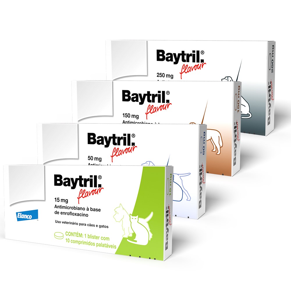Reconhecido por sua rápida absorção e excelente distribuição no organismo, o antibiótico Baytril oferece ação eficaz mesmo em casos de microrganismos resistentes a outros antibióticos. Baytril está disponível nas versões Baytril 15mg, Baytril 50mg, Baytril 150mg e Baytril 250mg com comprimidos palatáveis que facilitam a administração. Indicado especialmente para casos de piodermite, otite, infecção respiratória em cães, infecção urinária e infecções decorrentes de procedimentos cirúrgicos.