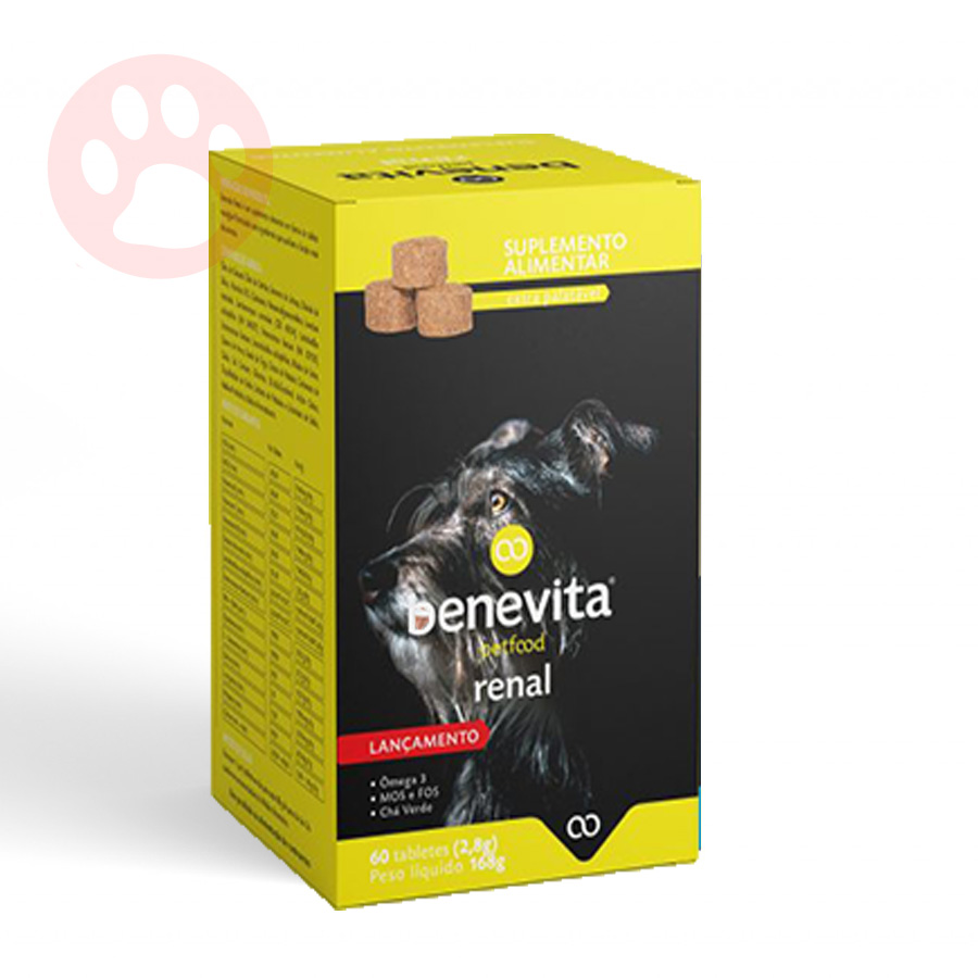 Suplemento Benevita Petfood Renal é um suplemento alimentar em forma de tablete mastigável formulado com ingredientes que auxiliam a função renal dos animais.