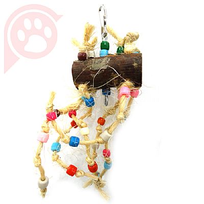 Brinquedo feito de madeira e miçangas coloridas, próprio para o pássaro se pendurar e balançar. Indicado para aves de porte pequeno