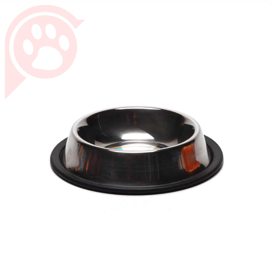 Comedouro inox anti-derrapante pequeno tem capacidade de aproximadamente 240ml. Sua base emborrachada permite que o produto escorregue no momento em que o animal estiver utilizando o produto, proporcionando mais conforto e evitando desperdiço da ração.