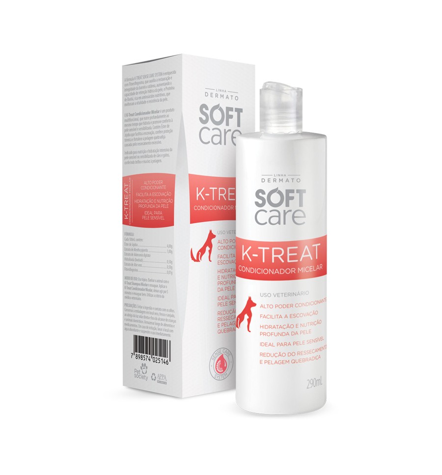 O Condicionador Micelar Soft Care K-Treat é um dermocosmético indicado para a hidratação e nutrição da pele e da pelagem de cães e gatos, especialmente em animais com pele sensível ou sensibilizada. Sua fórmula foi desenvolvida com bioativos que auxiliam na recuperação da barreira cutânea e na manutenção da saúde da pele.