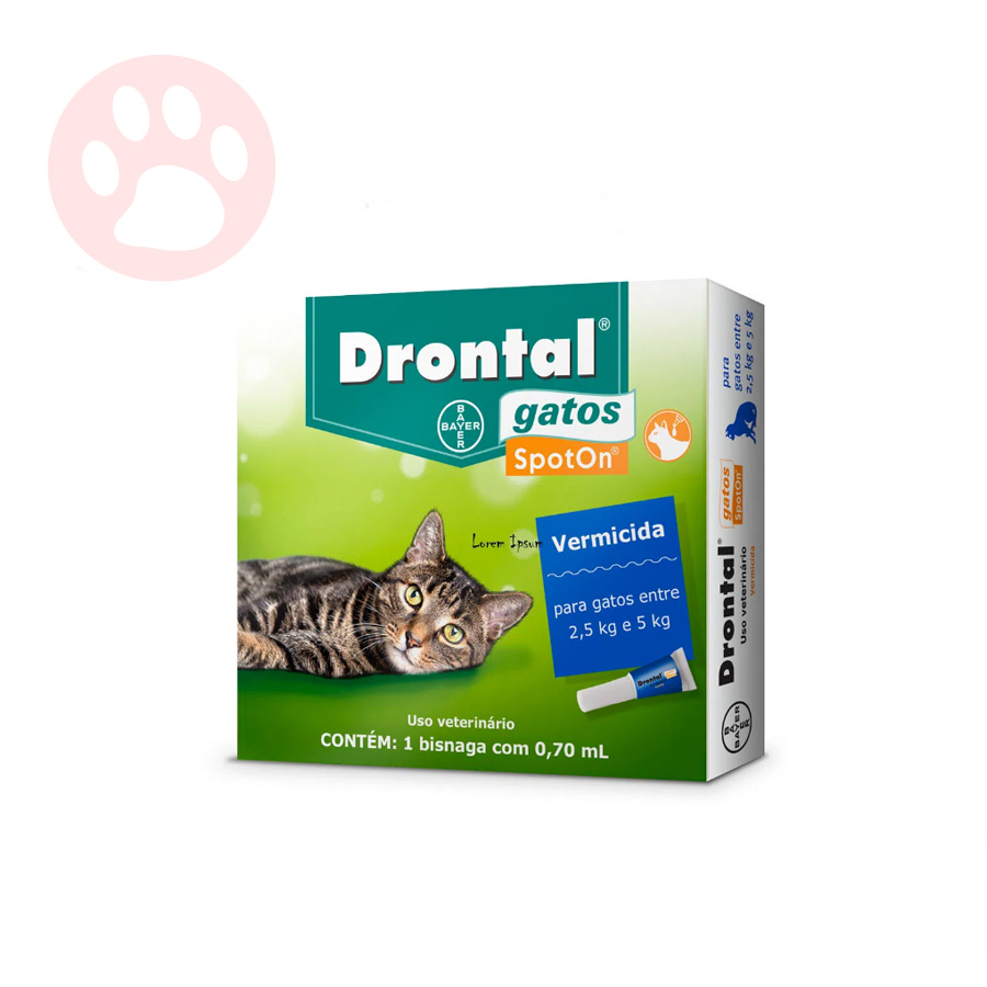Vermífugo Drontal Spot On 0,70 ml é uma solução prática e eficaz para o combate de verminoses em gatos com peso entre 2,5 kg e 5 kg, oferecendo tratamento completo com uma única aplicação tópica, sem a necessidade de comprimidos e sem causar estresse ao animal. Especialmente indicado para o controle de verminoses mistas, sua fórmula atua contra formas adultas, imaturas e larvais dos principais parasitas intestinais felinos. É eficaz contra vermes chatos, incluindo Dipylidium caninum e Taenia taeniaeformis em estágios maduros e imaturos, além de Echinococcus multilocularis em estágio maduro. Também combate vermes redondos como Toxocara cati, Toxascaris leonina e Ancylostoma tubaeforme, abrangendo estágios maduros, imaturos e larvais.