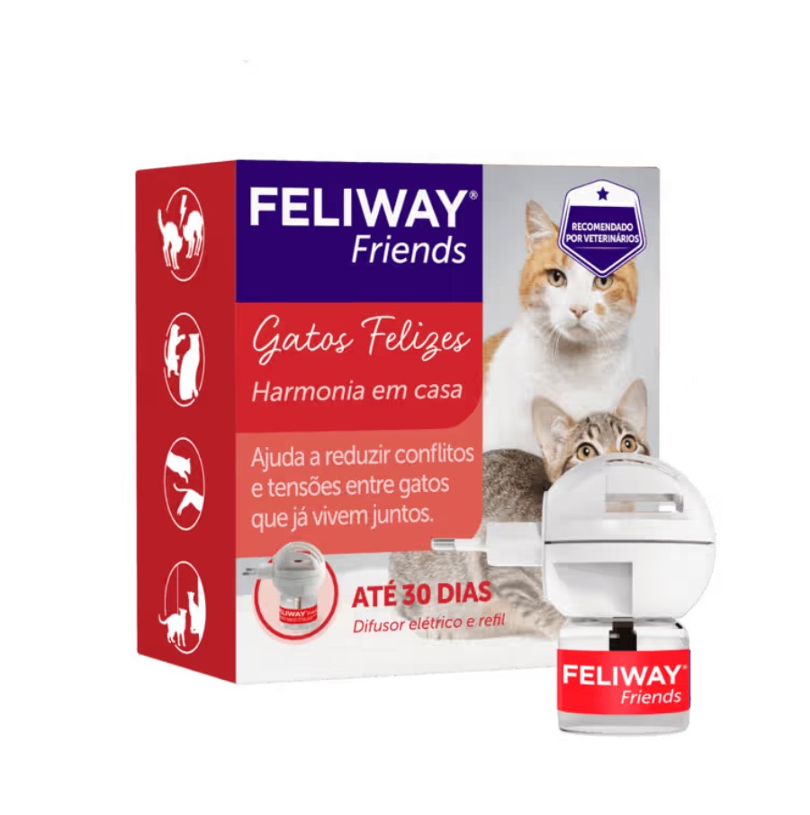 O produto é ideal para lares com múltiplos gatos, auxiliando na prevenção de comportamentos como brigas, perseguições, bloqueios de passagem e olhares fixos de tensão. Além disso, o Feliway Friends é clinicamente comprovado, utilizado e recomendado por veterinários como um complemento seguro e natural para melhorar a relação entre felinos, sem interferir em outros tratamentos comportamentais ou medicamentosos.