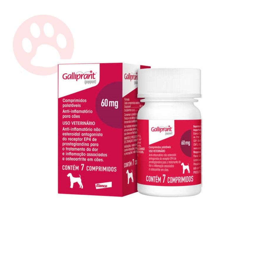 Galliprant 60mg é indicado no tratamento da dor e inflamação associados a osteoartrite em cães. Galliprant 60mg deve ser administrado por via oral, com ou sem alimento, uma vez ao dia, na dose recomendada de 2 mg/kg de peso corporal (equivalente a uma faixa de dosagem de 1,5 - 2,9 mg/kg de peso corporal). Não há período máximo de duração do tratamento. Para tratamentos de longa duração, é recomendado monitoramento apropriado.