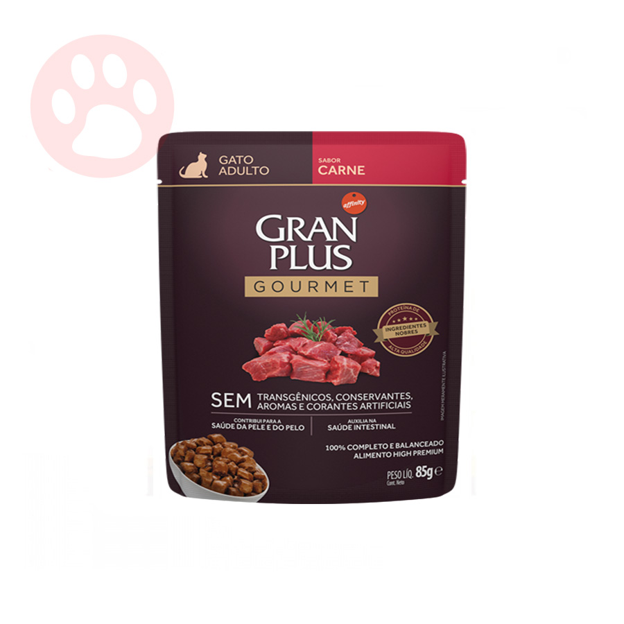 Ração Úmida Gran Plus Gourmet Gato Adulto Carne é um alimento completo úmido, sem transgênicos, conservantes, aromas e corantes artificiais indicadopara gato adulto.
