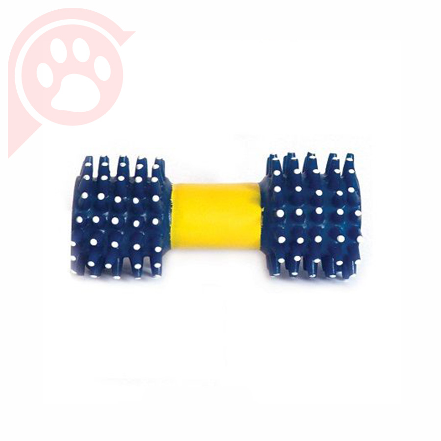 Brinquedo de borracha em formato de halteres. Produto atóxico e lavável próprio para seu cão morder.