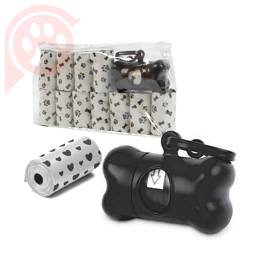 Kit Bone Bag contém 1 Porta Rolo de Saquinhos Cata Caca e 12 Rolos com 20 Saquinhos Cata Caca.