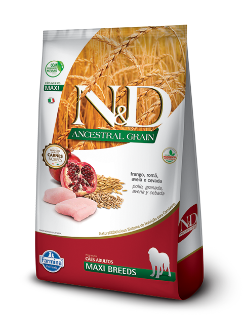 Ração N&D Ancestral Grain Frango e Romã para Cães Adultos Maxi Breeds foi desenvolvida especialmente para cães de raças grandes que exigem uma nutrição balanceada e funcional. Sua fórmula inclui ingredientes como cúrcuma, aloe vera, psyllium e chá verde, que auxiliam na saúde intestinal, imunológica e digestiva. Com cereais de baixo índice glicêmico, proporciona energia de liberação gradual, ajudando no controle de peso e na manutenção da massa muscular. É uma ração livre de transgênicos, com alta digestibilidade e ideal para cães de grande porte que precisam de suporte nutricional completo e saudável.