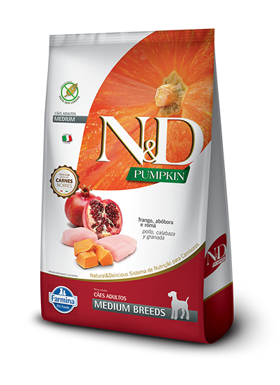 Ração N&D Pumpkin Frango, Abóbora e Romã para Cães Adultos de Raças Médias é um alimento completo e balanceado, formulado com ingredientes naturais e livre de cereais. Indicada para cães adultos de porte médio, sua composição une proteína de frango de alta digestibilidade com abóbora e romã, que oferecem fibras, antioxidantes e suporte imunológico.