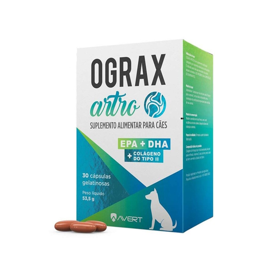 Suplemento Ograx Artro 20 é um suplemento nutricional composto por nutrientes essenciais às articulações: EPA + DHA + colágeno do tipo II. Indicado para cães que se beneficiem do aporte desses nutrientes.