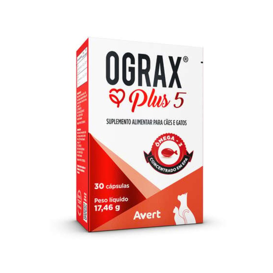 O suplemento também contribui para a saúde cardiovascular e equilíbrio metabólico, fortalecendo o organismo e apoiando o bem-estar geral. Graças à sua pureza e concentração de EPA, o Ograx Plus 5 oferece máxima eficácia e segurança para cães e gatos de todas as idades, sendo uma escolha ideal para tutores que buscam o melhor para a saúde de seus animais.