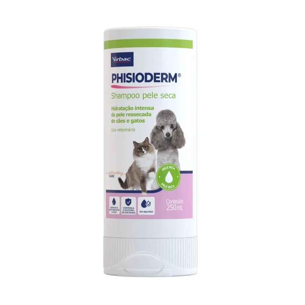 Phisioderm Shampoo pele seca é indicado para uso em cães e gatos, na limpeza da pele normal ou seca e como hidratante em condições de pele ou pelos ressecados.