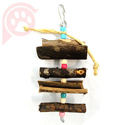 Brinquedo feito de madeira e miçangas coloridas, próprio para o pássaro se pendurar e balançar. Indicado para aves de porte pequeno.