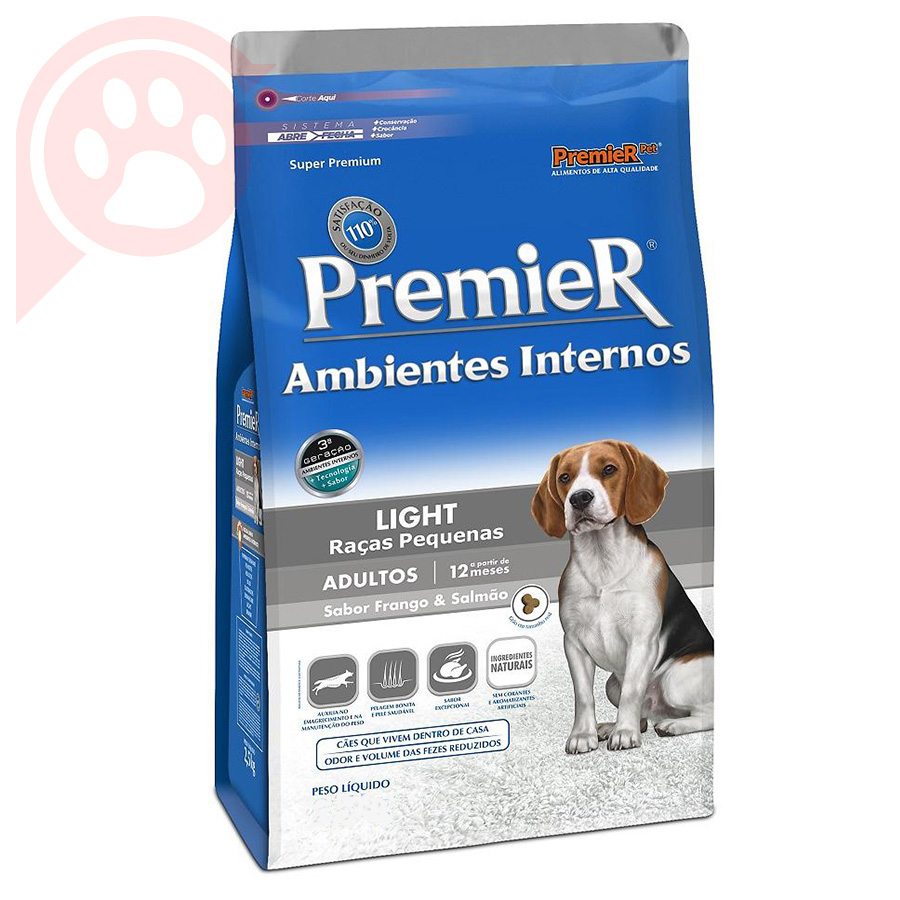 A Ração Premier Ambientes Internos Cães Adultos Raças Pequenas Light é um alimento Super Premium desenvolvido para auxiliar no controle e na redução de peso de cães adultos de pequeno porte que vivem dentro de casa. Sua fórmula exclusiva contém níveis reduzidos de gorduras e calorias, garantindo uma alimentação balanceada sem abrir mão do sabor irresistível do salmão, ingrediente nobre e altamente palatável. Além de promover a manutenção da forma ideal, a Ração Premier Ambientes Internos Light contribui para a saúde intestinal por meio da combinação de fibras especiais e extrato de yucca, que reduzem o volume e o odor das fezes, proporcionando mais conforto e praticidade no dia a dia. Completa, nutritiva e funcional, é a escolha ideal para cães que precisam de cuidados especiais com o peso, sem perder energia, vitalidade e qualidade de vida.