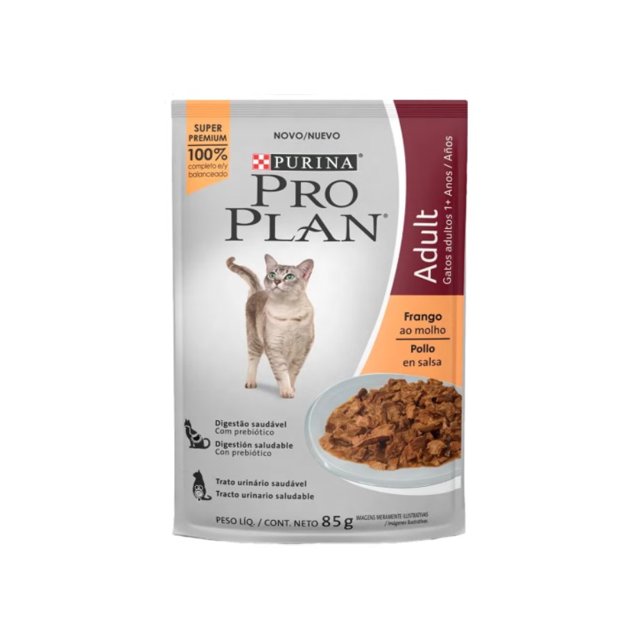 Ração Úmida Pro Plan Sachê Gatos Adultos Frango ao Molho é um alimento Super Premium, 100% completo e balanceado, desenvolvido para atender às necessidades nutricionais de gatos adultos de todas as raças. Sua fórmula exclusiva combina proteínas de alta qualidade, vitaminas e minerais essenciais para garantir saúde, energia e vitalidade. Com o irresistível sabor de frango ao molho, oferece uma refeição deliciosa que agrada até os paladares mais exigentes, além de contribuir para a hidratação diária do seu felino. Produzido pela Purina Pro Plan, este alimento úmido promove bem-estar, mantém a musculatura saudável, fortalece o sistema imunológico e proporciona mais qualidade de vida para o seu gato. Uma escolha nutritiva, saborosa e de confiança para quem busca o melhor para o seu pet.