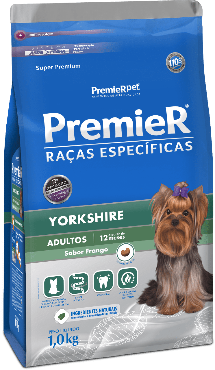 Ração Premier Raças Específicas Yorkshire Adulto é indicada para cães adultos da raça Yorkshire em manutenção, um alimento completo, balanceado e rico em nutrientes.