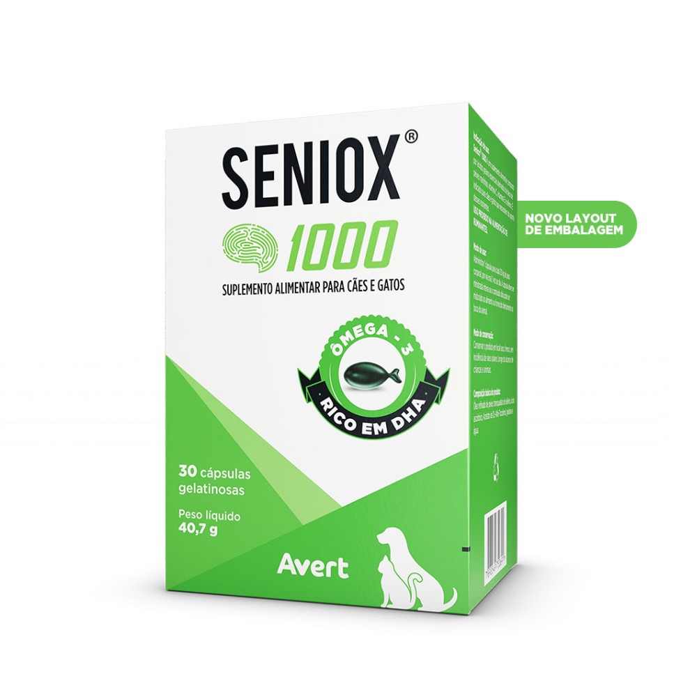 Suplemento Seniox 1000 é indicado para cães e gatos que necessitam de um aporte nutricional reforçado com foco na proteção celular e no suporte ao organismo. Sua fórmula é composta por ácidos graxos essenciais provenientes de óleos de peixes marinhos, que desempenham um papel importante na manutenção da saúde da pele, pelagem, articulações e no equilíbrio das funções cardiovasculares e imunológicas.