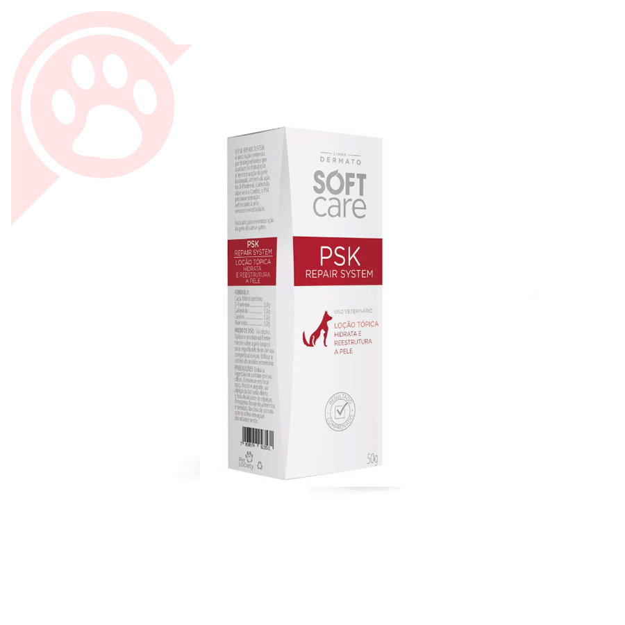 Loção Hidratante PSK Repair System é indicado para amenizar a sensação de coceira, diminuir o auto-traumatismo e auxiliar o processo de restauração da integridade da pele. A loção contém ativos que hidratam, conferem elasticidade e refrescância à pele, além de um ativo específico que possui sabor extremamente amargo, o qual evita o comportamento de lambedura.