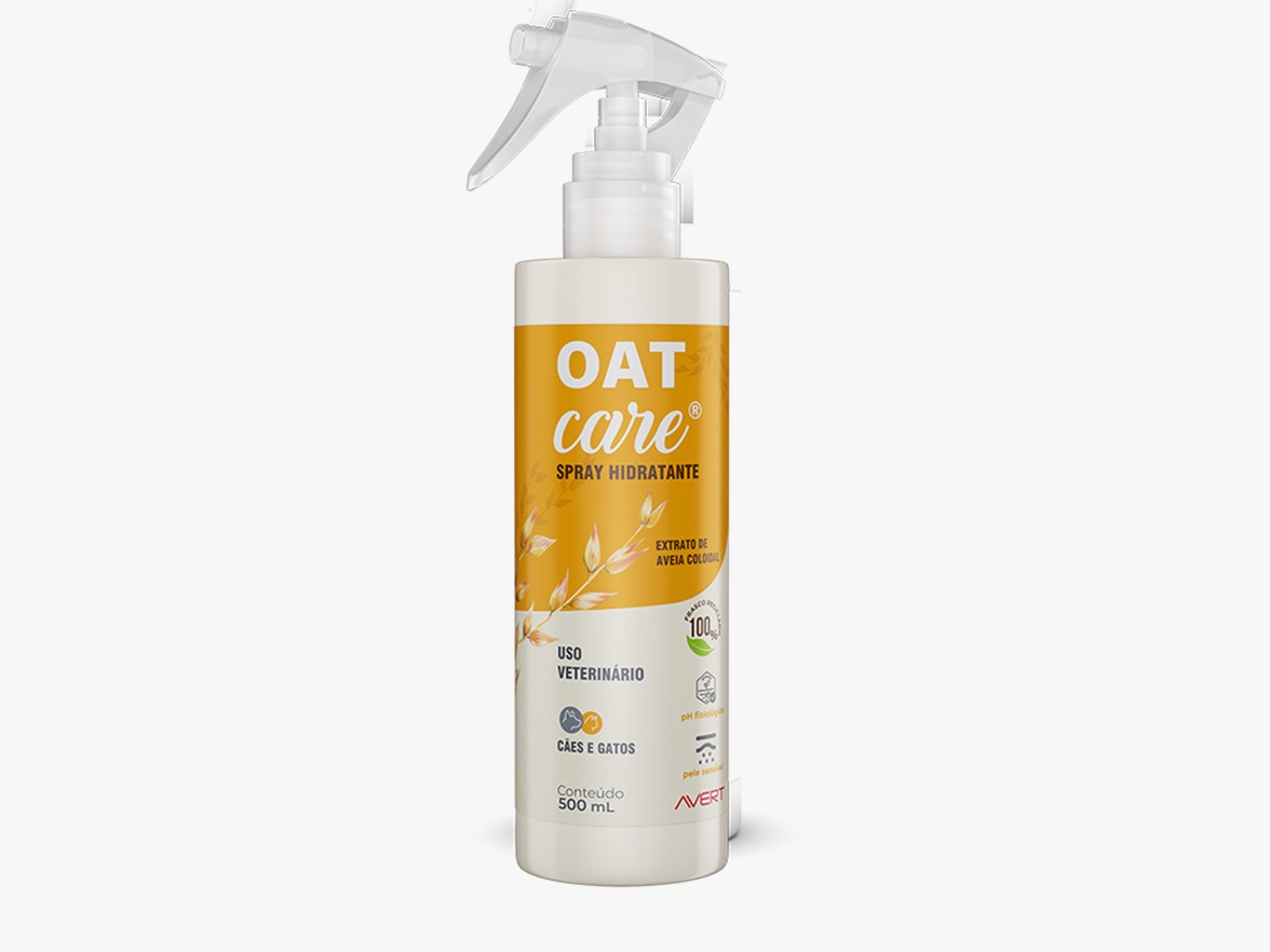 Spray Hidratante Oat Care é indicado para cães e gatos para promover hidratação e recuperação do aspecto natural da pele.
