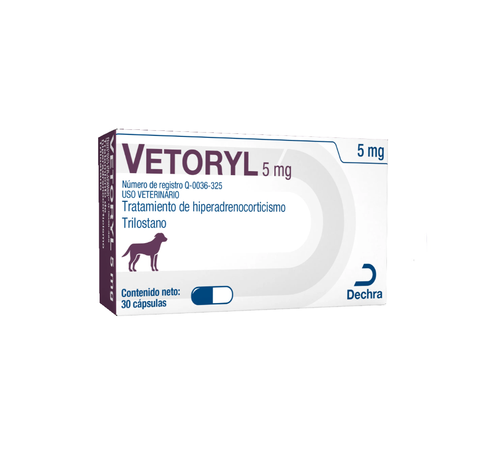 Vetoryl 5mg é um medicamento utilizado para o tratamento da Síndrome de Cushing (Hiperadrenocorticismo) em cães. Ele contém trilostano, um inibidor enzimático de ação curta da 3B-hidroesteróide desidrogenase, que age na redução dos níveis de cortisol circulante, um hormônio produzido em excesso em cães com esta condição.